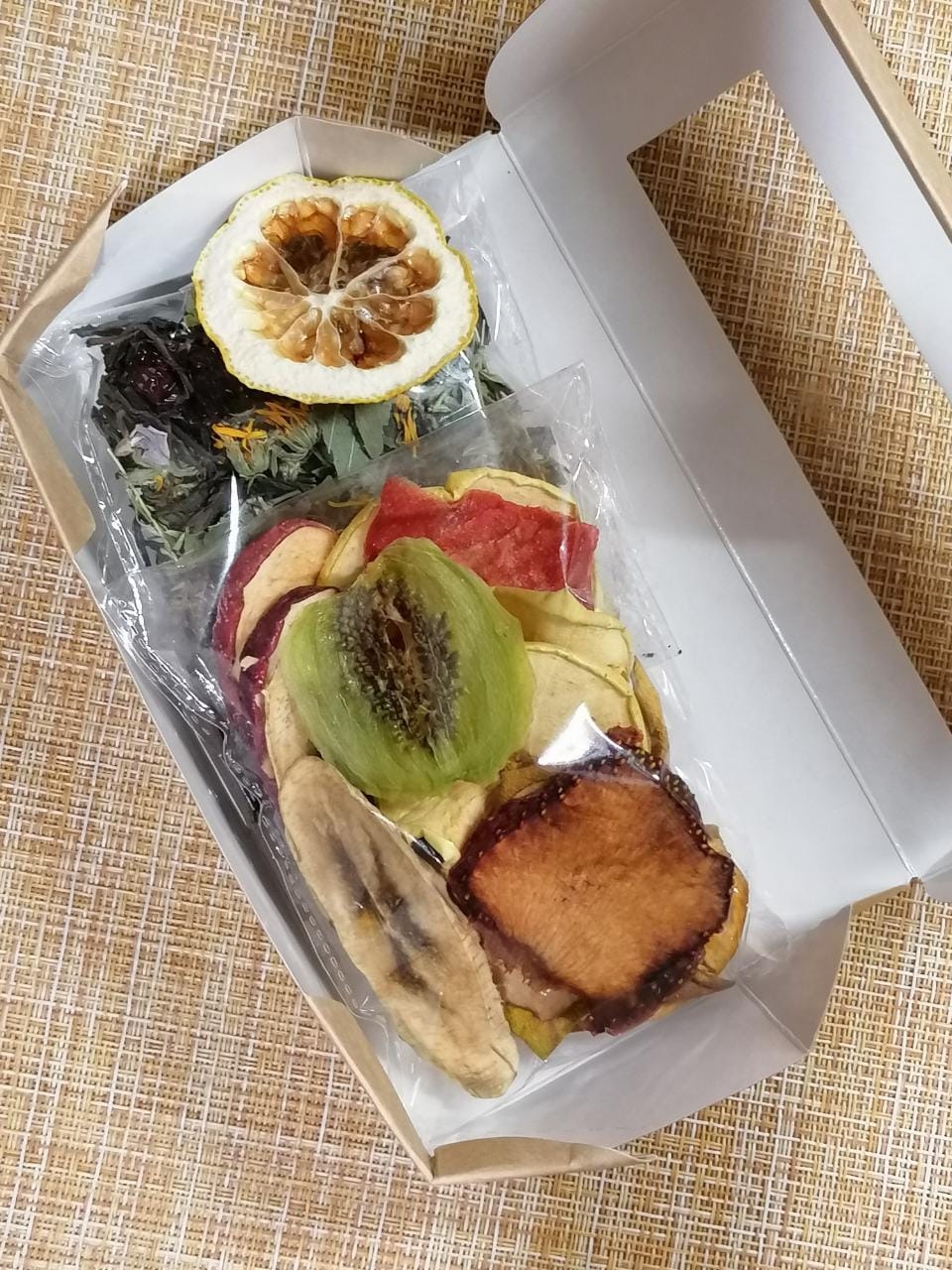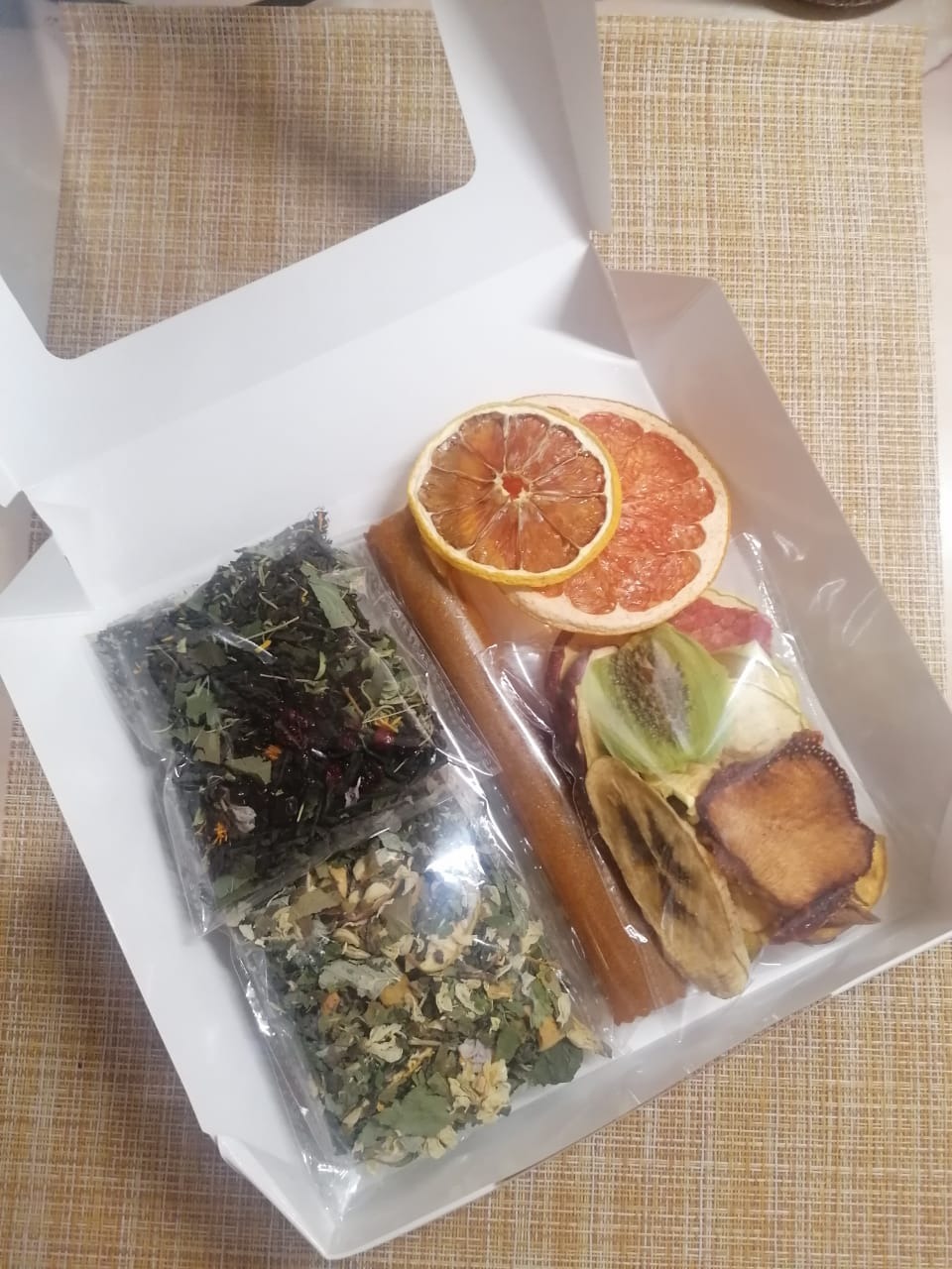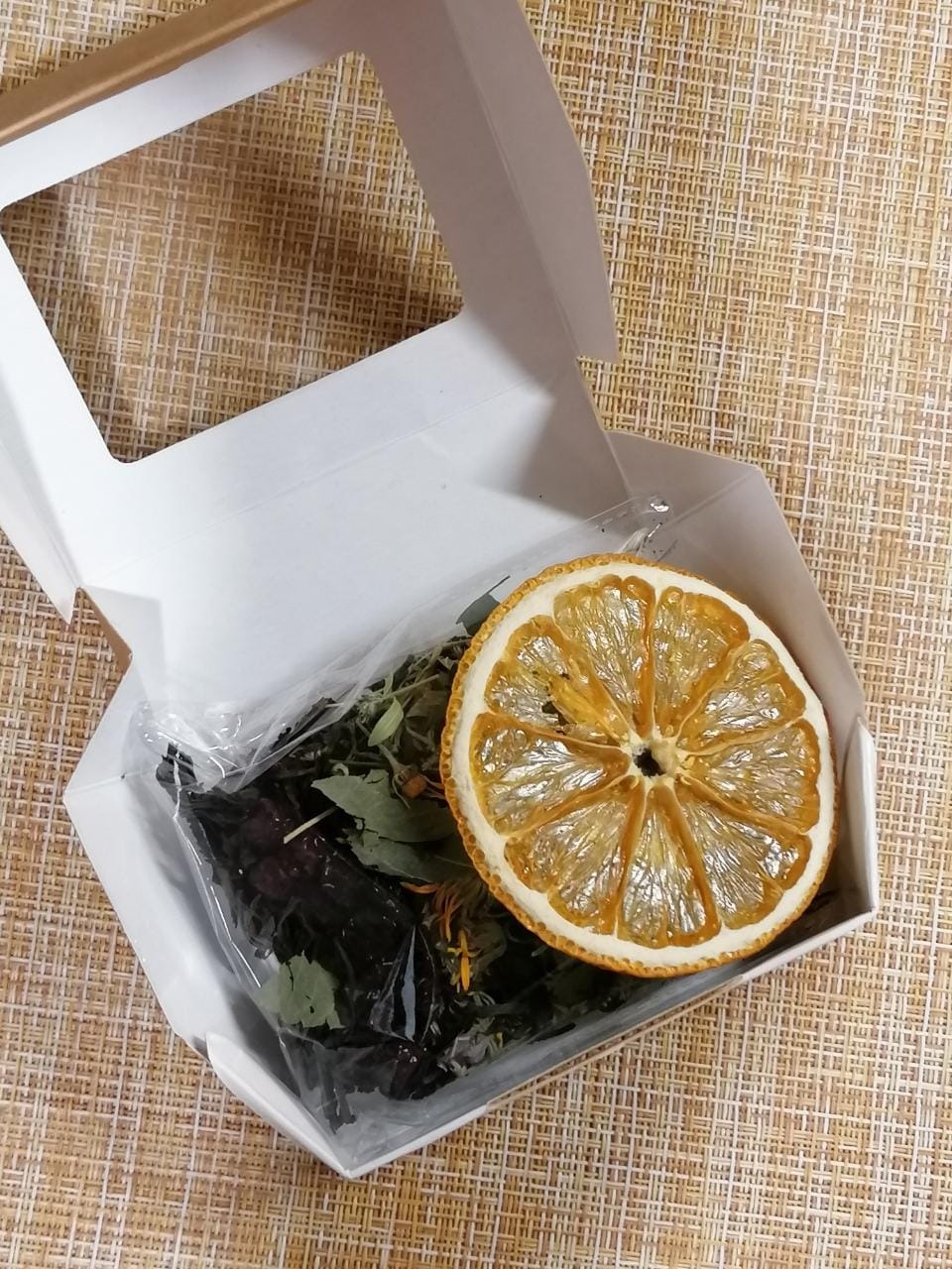 Данный набор набор состоит чая в обычной упаковке + цитрусовый слайс. Параметры подарочной коробочки 7 см х 9 см